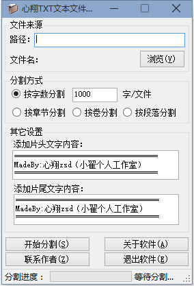 心翔TXT文本文件分割器 2009-02-26 09:52:00 大一的寒假开发的,当时有同学说先小说的时候如果文件比较大,记事本打开比较慢,问我又没啥好办法,考虑到记事本渲染大量文本效果不理想,才有了开发这个东西的想法。 使用VB.NET开发,貌似做完就没用过,哎~~  非特殊说明,均为原创,原创文章,未经允许谢绝转载。 原始链接:心翔TXT文本文件分割器 赏 Prev 文件分割器 Next 文件夹美化大师