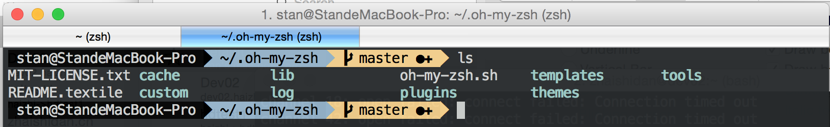 超级无敌,霸气,装逼神器——zsh 2015-01-22 14:40:57 bash用的时间长了,发现有不少缺陷的地方,比如cd到一个目录的时候,如果目录是以大写字母开头,敲的时候就必须是大写,等等不少不方便的地方就不一一列举了。 早有耳闻zsh是个很牛叉的shell,可以替代bash。 磨刀不误砍柴功,今天学了下zsh相关的东西,发现这货还真是能够很大的提升效率呢。 启用zsh后,再把oh-my-zsh安装一下,就很完美了。 oh-my-zsh默认的主题没有用户和主机信息看起来挺不爽的,修改了下`vi .oh-my-zsh/themes/robbyrussell.zsh-theme`,代码如下: ``` local ret_status="%(?:%{$fg_bold[green]%}➜ :%{$fg_bold[red]%}➜ %s)" local user_host="%{$terminfo[bold]$fg[green]%}%n@%m%{$reset_color%}" PROMPT='${ret_status}${user_host}%{$fg_bold[green]%}%p %{$fg[cyan]%}%c %{$fg_bold[blue]%}$(git_prompt_info)%{$fg_bold[blue]%} % %{$reset_color%}' ZSH_THEME_GIT_PROMPT_PREFIX="git:(%{$fg[red]%}" ZSH_THEME_GIT_PROMPT_SUFFIX="%{$reset_color%}" ZSH_THEME_GIT_PROMPT_DIRTY="%{$fg[blue]%}) %{$fg[yellow]%}✗%{$reset_color%}" ZSH_THEME_GIT_PROMPT_CLEAN="%{$fg[blue]%})" ``` oh-my-zsh默认启用了git插件,可以通过配置`vi ~/.zshrc`启用更多的插件,我启用了以下插件: ``` plugins=(autojump z git osx) ``` autojump和z这两个插件可以非常方便的在目录间跳转。 又发现一个帅到爆的主题:agnoster 首次配置上显示的有些问题,像这样:  后来找到了某个版本的设置是可以的,执行以下命令就OK了: ``` cd ~/.oh-my-zsh/themes/ git checkout d6a36b1 agnoster.zsh-theme ``` 最终效果如下:  参考链接: 使用 Zsh 的九个理由: <http://blog.jobbole.com/28829/> zsh与oh-my-zsh: <http://www.yangzhiping.com/tech/zsh-oh-my-zsh.html> iTerm2 + zsh: <http://xingrz.me/2013/2013-06-19/terminal-zhuangbility.html> 除了oh-my-zsh,还有个不错的项目是Prezto:<https://github.com/sorin-ionescu/prezto> Prezto比oh-my-zsh更轻量级一些,不过还是感觉oh-my-zsh功能上更为丰富,谁让人家插件和主题那么丰富呢! 非特殊说明,均为原创,原创文章,未经允许谢绝转载。 原始链接:超级无敌,霸气,装逼神器——zsh 赏 Prev 又学了两个好用的linux命令 Next Spark-Sql一个怪异的启动问题